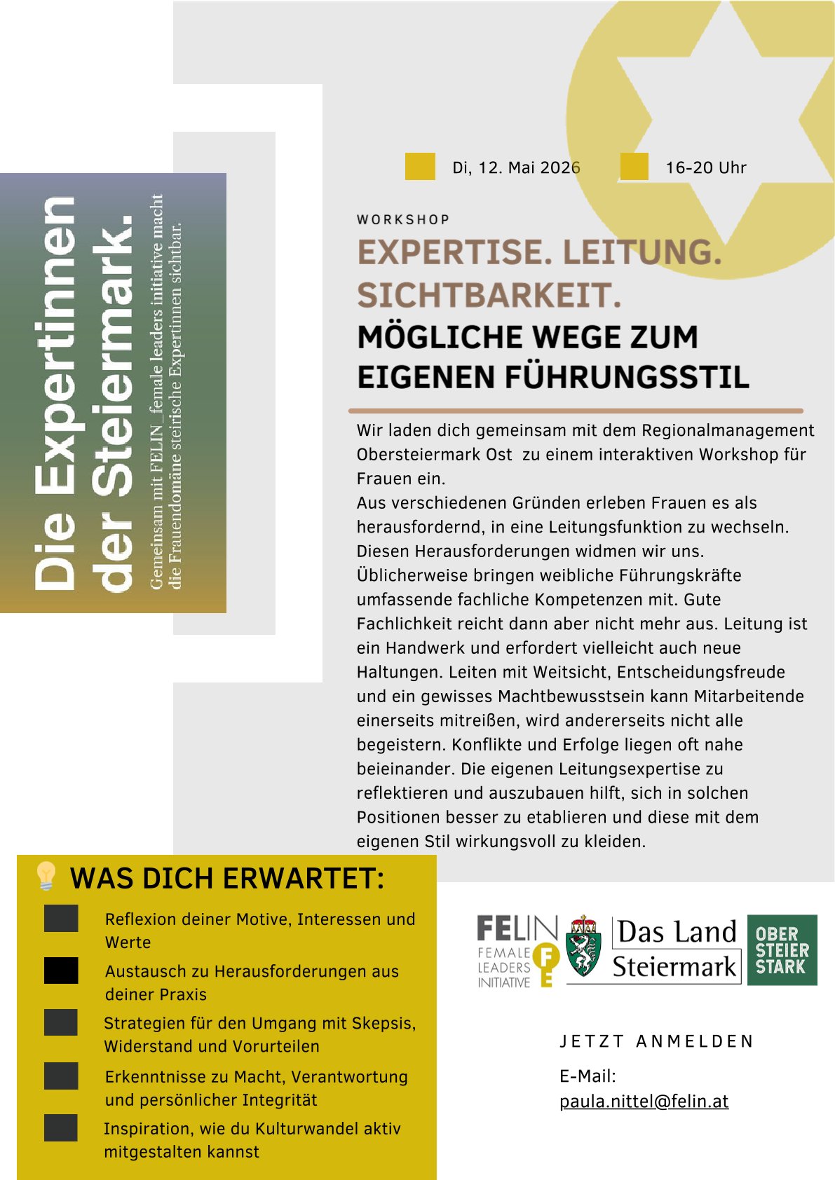 - Liezen: Donnerstag, 15. Oktober 2026, 16-19 Uhr danach Austausch/Vernetzung Anmeldung bis spätestens 08. Oktober unter paula.nittel@felin.at